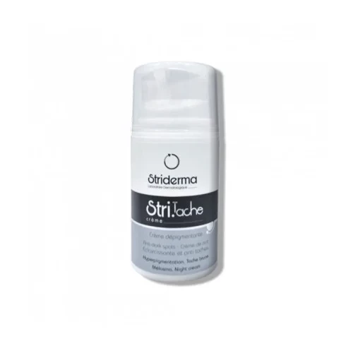 La crème stri tache associe des actifs dépigmentant validés pour le processus de dégradation de la mélanine et l’inhibition de la synthèse de la tyrosinase pour une action curative et préventive de l’hyperpigmentation.