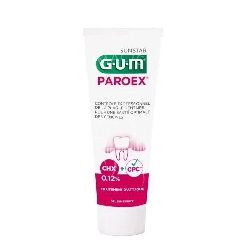 Paroex Dentifrice Gel de GUM contient 0,12% de chlorhexidine connu pour ses propriétés antiseptiques. Ce dentifrice vous permet de lutter contre les problèmes de gingivites et contre la plaque dentaire. Il est particulièrement recommandé en traitements post-chirurgical et notamment dans le cas d'une extraction dentaire ou de la pose d'un implant.